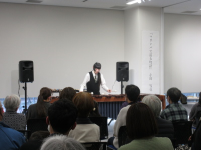 小川智也さんのマリンバの演奏や学校図書館を活用した学習展示、