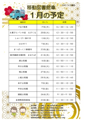 移動図書館車の1月の予定表です。